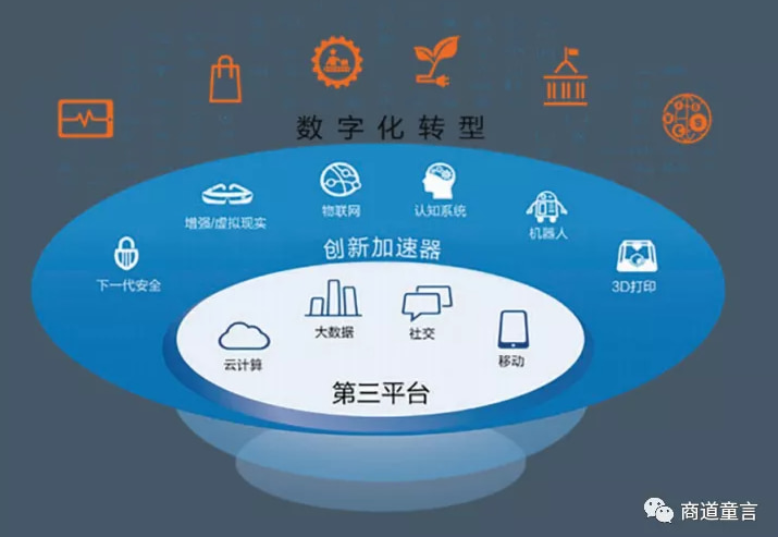 数字化转型的驱动要素,可以分为两类,一类是以云计算、大数据等为代表的平台型技术;另一类是AR/VR、物联网、人工智能等的创新加速类技术。