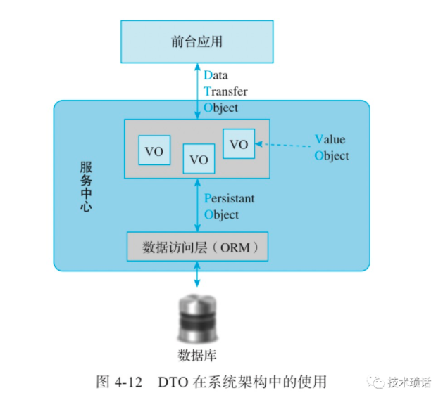 DTO可以将服务中心复杂或易变的数据对象对前台应用屏蔽,让前台具备更好的稳定性。DTO是系统分层设计和服务化架构中经常使用的技术,概念本身也容易理解,如图4-12所示。