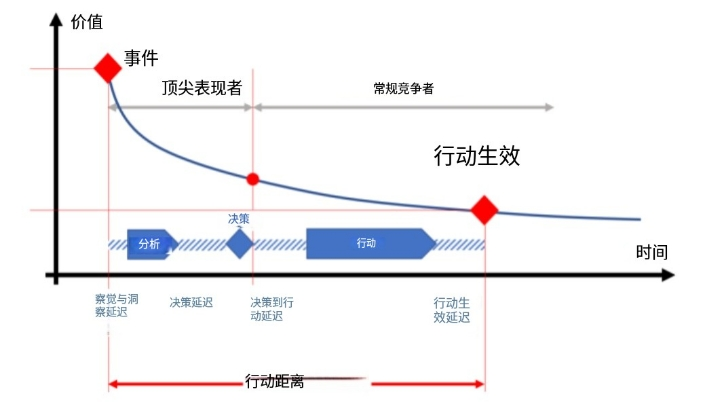 由于在许多竞争激烈的市场中,客户都在等待即时(理解为非常快速)的响应,因此对请求的响应的价值正在迅速下降。这是因为反应最快、反应适当和可接受的竞争者很可能获得所有好处,而反应较慢的竞争者可能来得太迟,交易已经完成,没有机会了。关键成功因素之一是使组织能够快速反应,及时接近触发事件,换句话说,沿着价值曲线向上移动。触发事件和采取的动作之间的延迟也被称为“动作距离”。