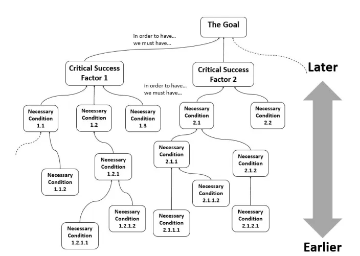 有了目标树,理性分析从既定目标开始,列出实现目标所需的所有先决条件。这些所谓的必要条件按逻辑顺序排列,显示出必要条件的树状网络。