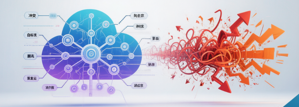 这个工具在逻辑思维工具箱中显得与众不同:它的形状与其他工具完全不同(既不是树状结构,也不能被称为“倒下的树”……)。其名称则源自诗中一段令人费解的描述。因此,我们没有给它起一个像“冲突解决图”这样能准确反映其功能的名字。对于新手来说,这个工具缺乏明确的用途说明,实在是个讽刺——毕竟这个工具箱的目的是教人们如何进行逻辑性和批判性思考啊。“蒸发云”模型所基于的核心假设是:双方拥有共同目标,但各自的要求与前提条件存在矛盾。一方的诉求与另一方的需求相互冲突。这种矛盾有时会形成两难境地——比如在某个特定时间和地点,你收到了参加两个不同活动的邀请。既然你都想参加,那么该如何解决这个困境呢?