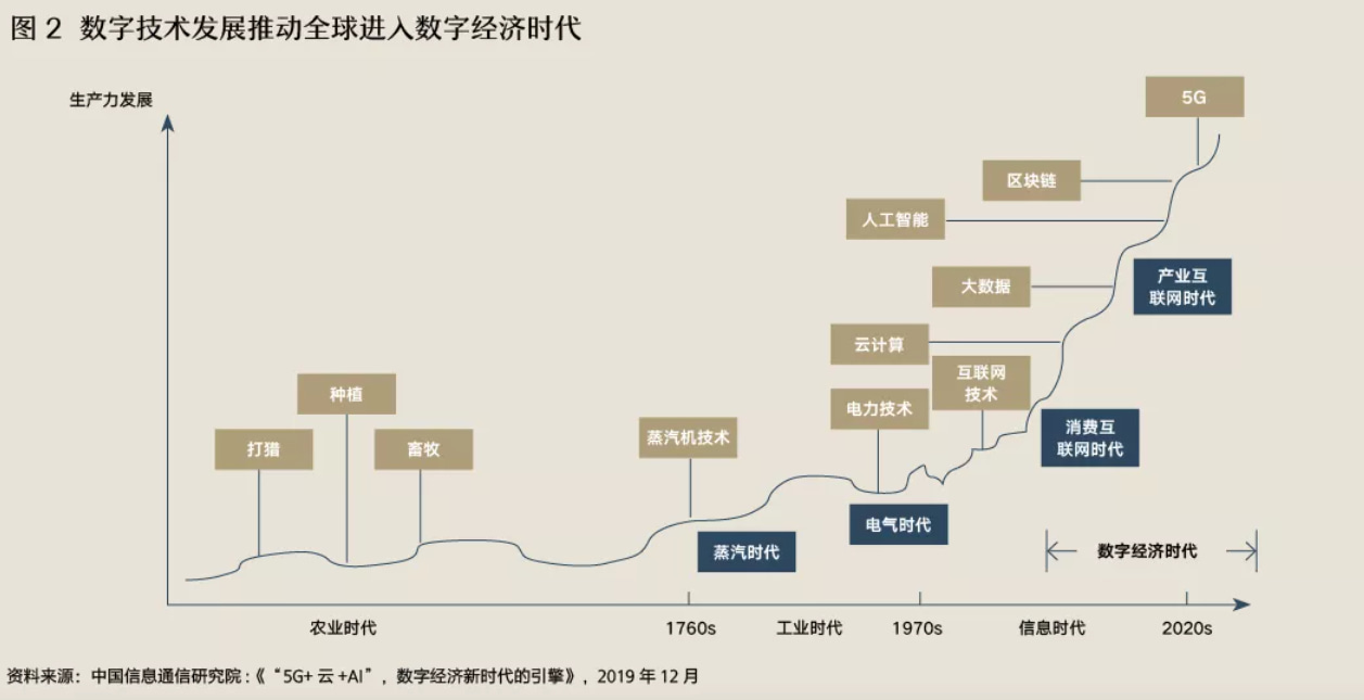 数字技术的发展,不断地推动着人类生产力的进步:从农业时代到工业时代,从信息时代到未来的数字经济时代。在农业时代,技术发展缓慢,生产力迭代也随之较慢;而在工业时代之后,生产力加速发展,蒸汽机、电、互联网等技术在近百年的时间内,极速地加剧生产力的更新和跃迁(图2)。