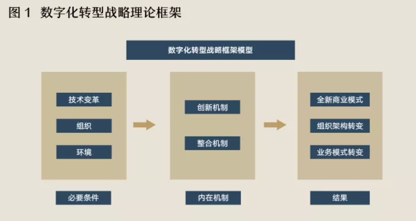 图1是我们通过案例分析总结出的数字化转型战略的理论框架。数字化转型战略,简而言之,就是通过技术变革、组织、环境等外部必要条件,配合创新机制和整合机制作为内在机制,推动企业的变化—— 全新的商业模式、组织架构的转变和业务模式的转变。