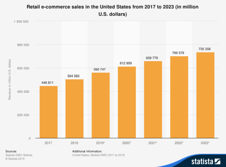 消费者行为最显著的变化之一就是购物方式的转变。如下图显示,预计到2023年,美国电子商务零售额将超过7亿美元。自2017年以来,美国电子商务零售额已增长了60%。