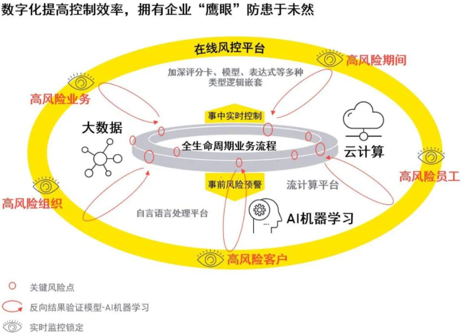 相较于传统的简单规则逻辑判断,进行评分卡、模型、表达式等多种类型的逻辑嵌套,实现层次更加丰富的逻辑运算,融入了自言语言处理平台、流计算平台等,进一步提升了风险引擎的算力和处理时效。这样实时锁定高风险业务、高风险客户、高风险员工、高风险组织、高风险期间,提高经营过程的规范性。例如在银行行业通过风险控制系统识别支付/转账欺诈、营销活动作弊、衡量账户风险等。