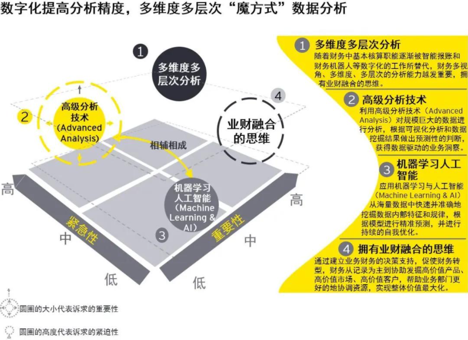 通过建立业务财务的决策支持,促使财务转型,财务从记录为主到协助发掘高价值产品、高价值市场、高价值客户,帮助业务部门更好地协调资源,实现整体价值最大化。利用高级分析技术(Advanced Analysis)对规模巨大的数据进行分析,根据可视化分析和数据挖掘结果做出预测性的判断,获得数据驱动的业务洞察。同时应用机器学习与人工智能(Machine Learning & AI)从海量数据中快速并准确地挖掘数据内部特征和规律,根据模型进行精准预测,并进行持续的自我优化。将数据进行“魔方式”分析,从多个视角灵活组合,找到数据之间潜藏的逻辑关系,发掘市场规律,从而合理配置企业资源。